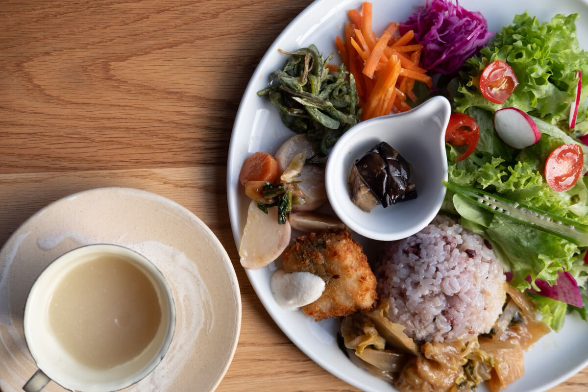 本店で人気のビーガンプレートランチは、麹惣菜やお米のヨーグルトなど、腸にやさしい工夫を重ねた一皿。